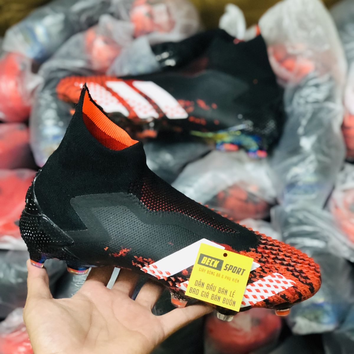 Giày Bóng Đá Adidas Predator 20+ Mutator Đen Mũi Đỏ Vạch Trắng Không Dây Cao Cổ V2 FG