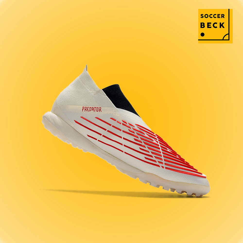 Giày Bóng Đá TQ Adidas Predator Egde+ Trắng Ngà Vạch Đỏ Không Dây Cổ Cao TF